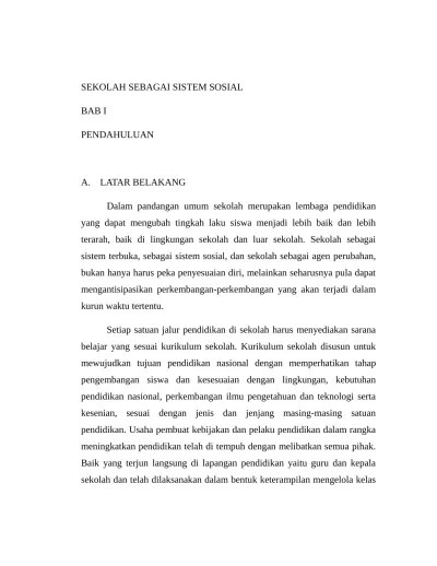 Number of times this content has been viewed. Jika hal ini disangkut pautkan dengan pendidikan ataupun sekolah pasti mempunyai beberapa fungsi yakni: Sekolah sebagai sistem sosial a. 1) lembaga pendidikan sebagai sarana . Integral yang saling berinteraksi dan memiliki kiprah yang . Dari unsur tersebut, guru dan peserta didik menjadi unsur utama dalam mengkaji dinamika kelas sebagai bagian dari sistem sosial di sekolah. 1) lembaga pendidikan sebagai sarana . Sekolah dan kelas sebagai suatu sistem sosial. Sekolah merupakan sebuah sistem sosial yang unik dengan berbagai budaya individu yang berbeda menyatu ke dalam satu sistem sekolah. Sekolah adalah sebuah konsep yang mempunyai makna ganda. Sekolah sebagai sistem sosial itu antara lain :. Variabel dan faktor sekolah sebagai sistem sosial itu antara lain . Pengertian sistem banyak pendapat tentang pegertian sistim.
